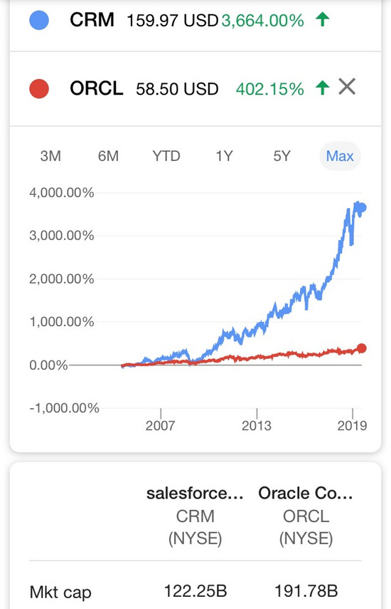 Salesforce(蓝色)和Oracle上市以来的历史股价与当前市值